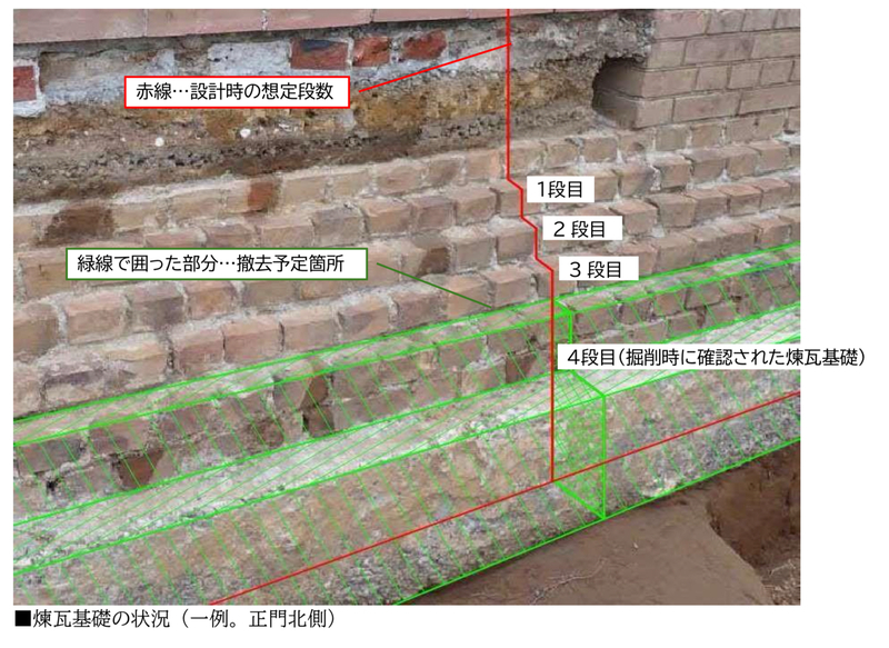 煉瓦基礎の一部撤去は、正門の現状変更には当たるものの、上述のとおり文化財保存の観点、工期延伸、安全性の確保等を総合的に判断し、設計書に合わせ撤去するという判断を行った。